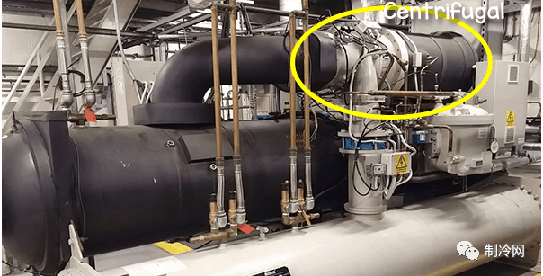 離心式壓縮機位于冷水機上方,有一個大的蝸殼形管道卷曲到冷凝器中。制冷劑通過吸入管流入,撞擊到葉輪的中心,葉片旋轉(zhuǎn)并將角速度施加到制冷劑上。該角速度使制冷劑在各個方向高速飛出,并聚集在蝸殼(外圈)中,利用動能轉(zhuǎn)化增加壓力,然后向下進入冷凝器。這種類型的壓縮機/冷卻器是大型建筑物中集中機房的常見裝置。